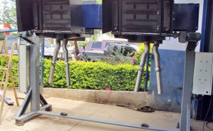 Colunas: construídas em aço carbono, soldado por processo de solda mig, com tratamento anti-corrosivo e pintura final em póliuretâno cinza automak.